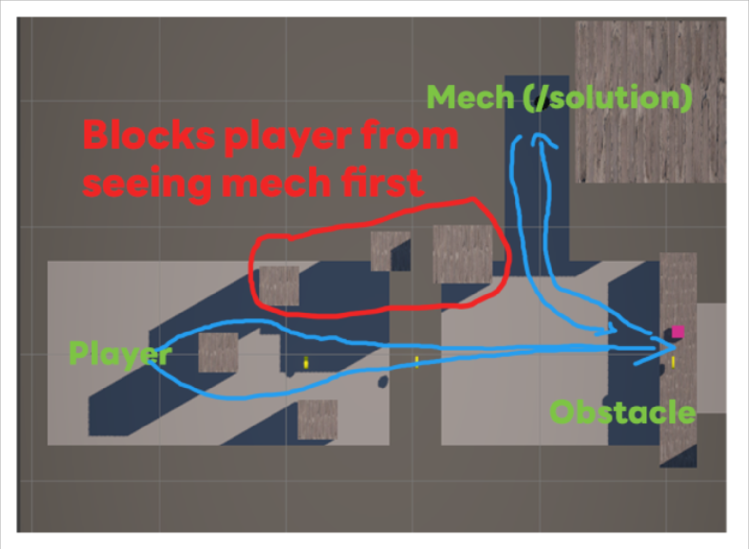 Which meant I never wanted the player to come across, or even see, the solution before facing the obstacle.